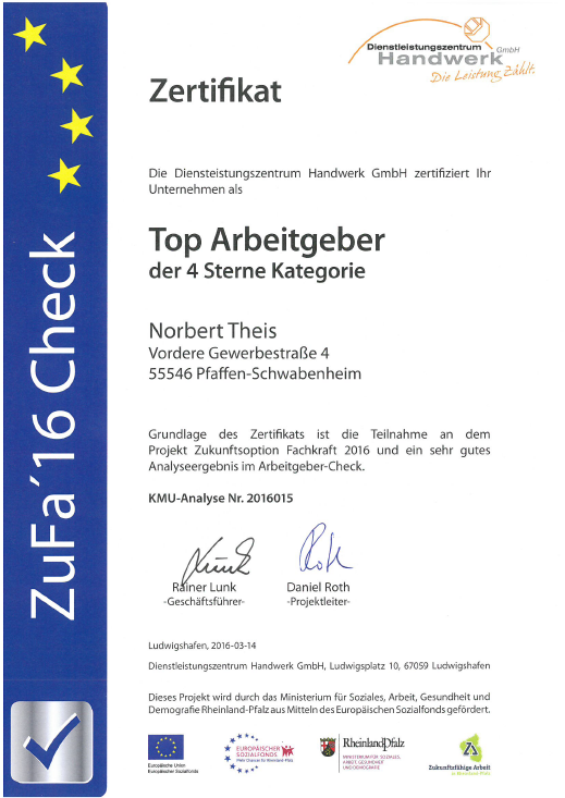 Im Jahr 2016 – zum 30-jährigen Meisterjubiläum – wurden die Maler- und Denkmalpflegewerkstätten vom Dienstleistungszentrum Handwerk KMU mit 4 Sternen ausgezeichnet. Eine Anerkennung für herausragende Qualität, Fachkompetenz und nachhaltige Betriebsführung.